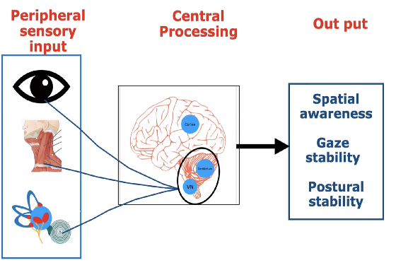 Peripherally, vision, proprioception and vestibular (Inner ear) systems contribute to balance control. Centrally, structures within the brainstem, cerebellum and several other brain areas are involved in processing the balance signals.